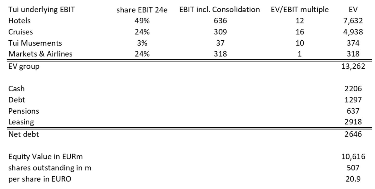 Based on that logic, my initial valuation of TUI was straightforward: €1.2 billion in EBIT × 10 = €12 billion enterprise value, from which I subtract net debt to arrive at the equity value.